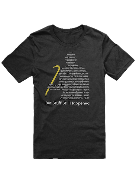 My personal favorite is the new Stuff Still Happened Tee, of which the design is available as a mug, sticker, and more!