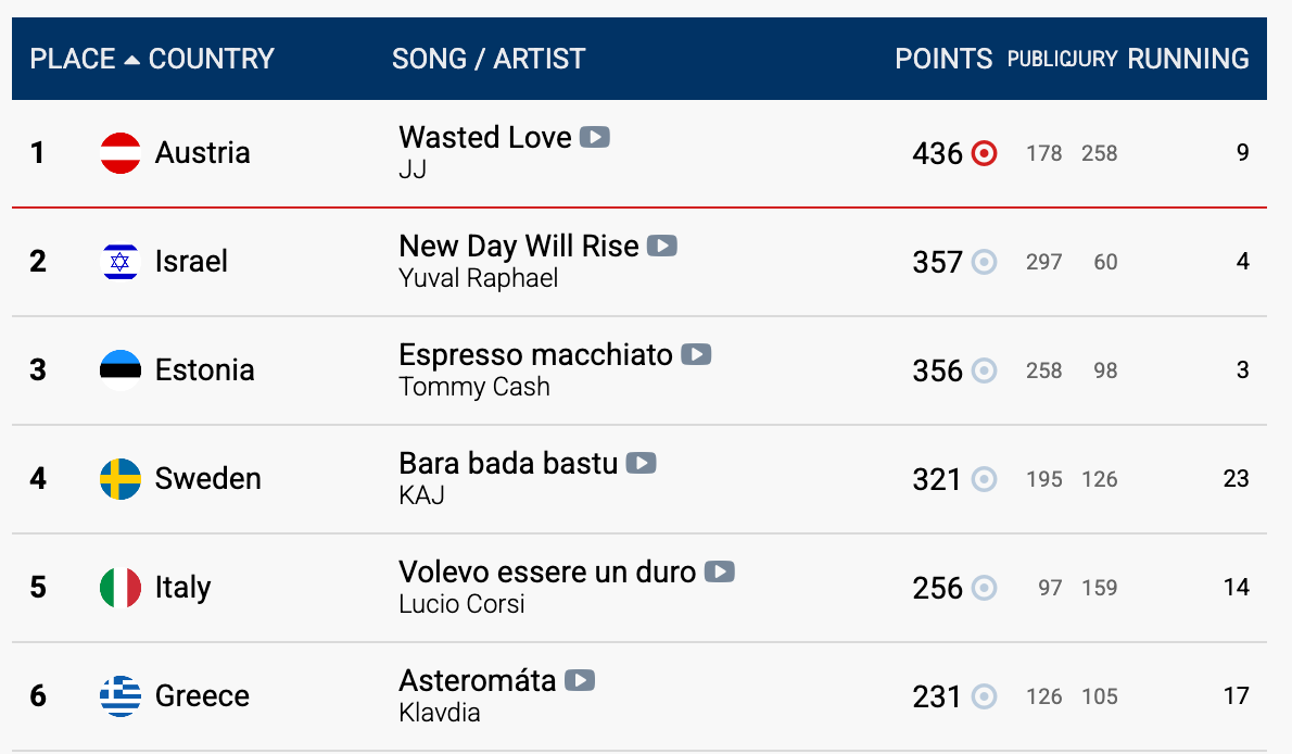 Austria took home first place, followed by Israel in second place and Estonia in third. Some of the voting comes from public input, which suspiciously voted overwhelmingly for Israel, breaking starkly with the score given by official judges. I'm sure there's nothing interesting going on there, but I do think it's worth taking a look at that second place country and see what they're up to.