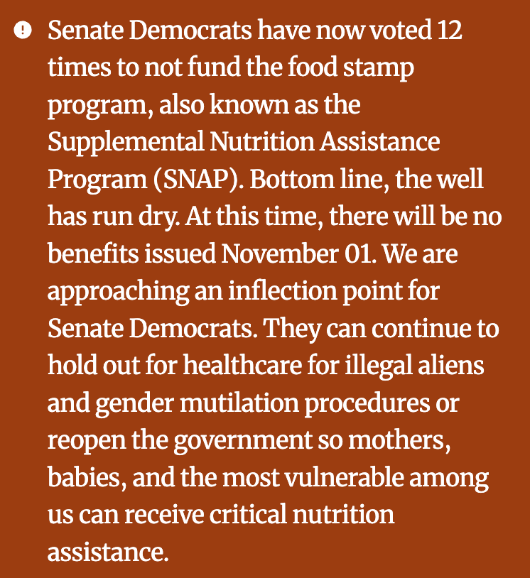 The US Federal Government—currently controlled entirely by the Republican party across all major branches—has announced that food assistance benefits (known as "SNAP" or "Food Stamps") will not be paid out for the month of November as the government remains shut down. Further, they will not be using the emergency funding available to them to provide the citizens of the country with nutrition assistance.