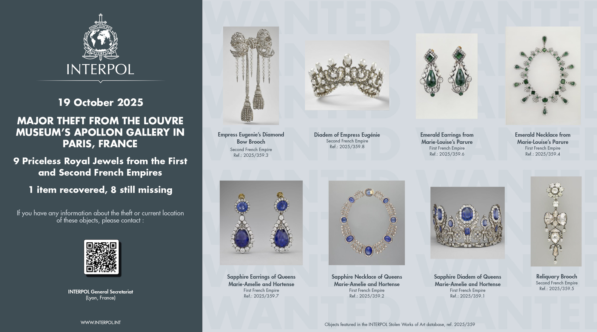 The thieves made out like… well, bandits. They targeted nine pieces of historic jewelry in the museum, though only made it out with eight. According to the Interpol report, one of the nine targeted pieces was found dropped on the floor. Still, the haul is valued at about €88 million, or a little over $100,000,000 USD.