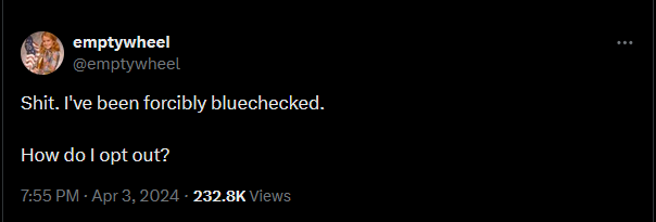 If you recall, when Elon Musk bought Twitter accidentally, one of the first things he did was make it so that having a blue checkmark was just about the least cool thing you could possibly do. Removed them all from verified accounts, and instead used the check mark to signify "this user is paying Elon Musk for a Twitter subscription." Its such an embarrassing sight that they had to roll out the option to hide the checkmark.