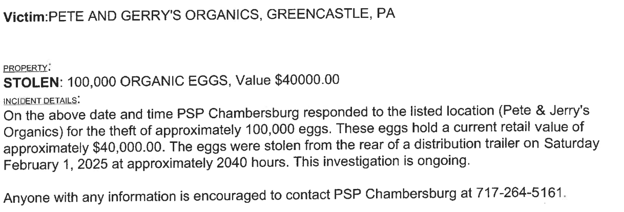 Someone stole 100,000 eggs out of the back of a distribution truck in Greencastle, PA. The stolen eggs amount to around $40,000 given today's prices, but honestly that could double tomorrow. Helluva bag.